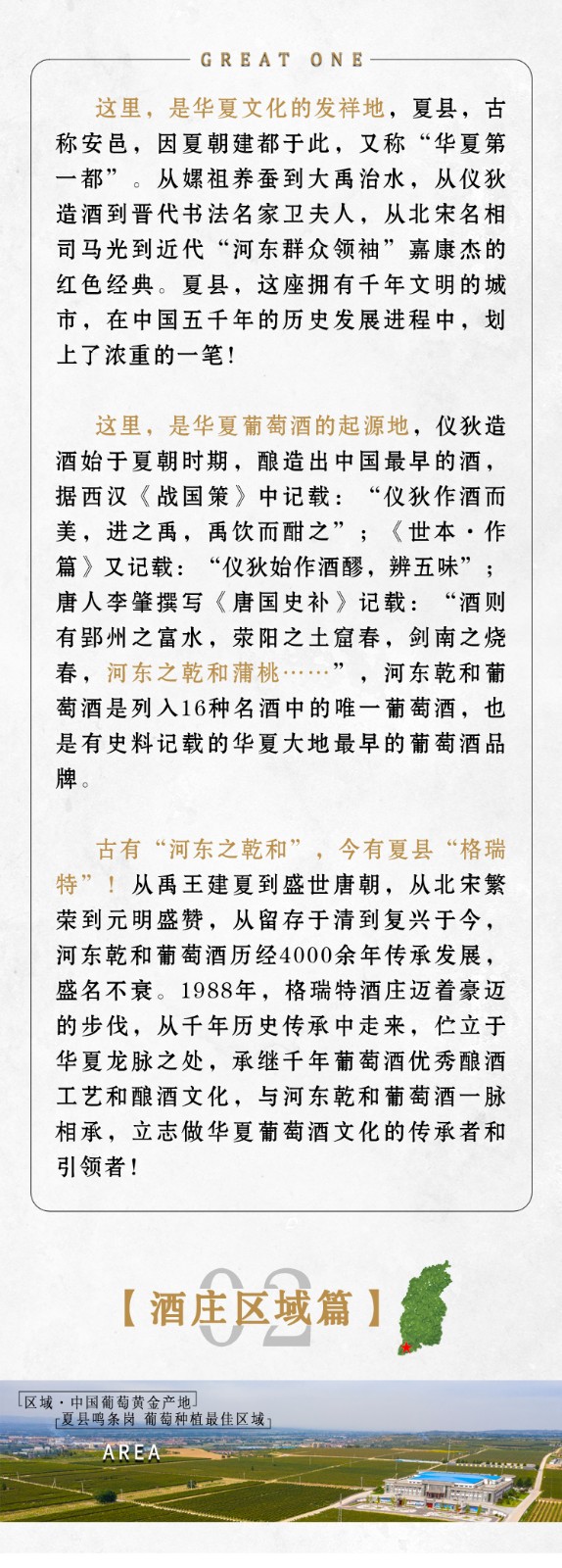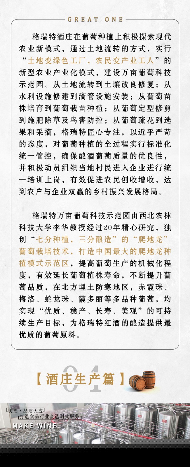 山西格瑞特酒莊有限公司成立于上世紀(jì)80年代,是一家集釀酒葡萄種植,釀酒生產(chǎn),農(nóng)業(yè)產(chǎn)業(yè)化,工業(yè)旅游化為一體